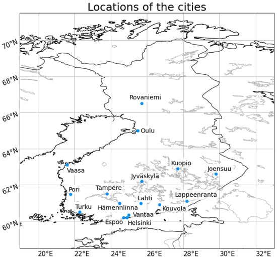 A total of 16 cities have been selected for this study (see Figure 1 and Table 1). According to the TVK’s data, the selected cities are among the 16 cities in Finland with the highest yearly slip amounts. In terms of population, the cities are the 15 largest ones in Finland, with Rovaniemi being the 17th largest. Places are located around Finland, thus representing different climatological areas from coastal areas to inland and from south to north. Helsinki, Espoo, Vantaa, Turku, Pori, Vaasa, and Oulu are located in the coastal area and the sea has a strong impact on the weather. Oulu is located further north and due to its northern location, it is colder and there is more sea ice in winter than in other coastal cities. Joensuu and Kuopio are the most continental sites having the longest distance to the sea, whereas Rovaniemi is located in the northernmost and climatologically coldest place. Other cities, Lahti, Kouvola, Hämeenlinna, Tampere, Jyväskylä and Lappeenranta, are located inland.