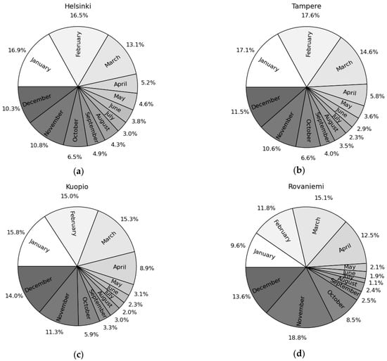 Pie charts showing the portion of each month’s slip injuries based on the TVK’s data for Helsinki (a), Tampere (b), Kuopio (c) and Rovaniemi (d) with a time range between 1 October 2005, and 30 September 2019. Different shades of gray present different months from January (white) to December (dark gray). Figures for all cities are presented in the Supplementary Material (Figure S1).