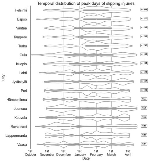 The temporal frequency distribution of peak days of slipping injuries in different cities in winters 2005–2019 presented on a violin plot. The width of the span corresponds to the frequency of slip injuries, the wider the distribution is the more slip injuries happen. The white dot within each box represents the median dates of the winter season slips. The box spans the 0.25 and 0.75 quantiles, and the whiskers represent the minimum and the maximum dates. Outliers are within the violin plot area. The number of peak days (n) is presented for each city on the right.