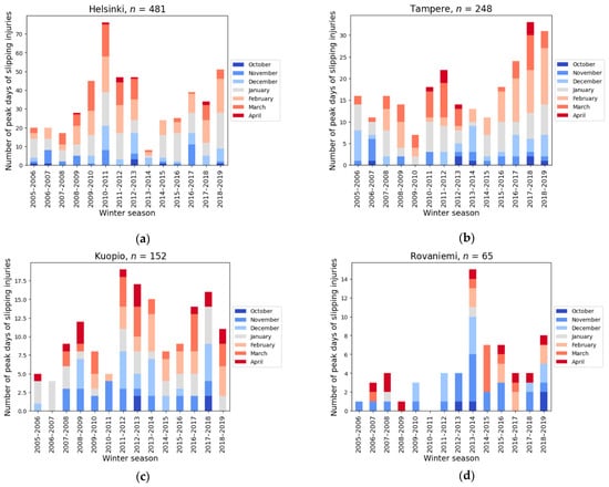 The monthly distribution of peak days for four of the cities is presented for all winter seasons (2005–2019) in Figure 4a–d (the full set of the figures can be found from the Supplementary Material Figure S2). The number of peak days per winter is the highest in Helsinki. The difference between winter seasons can be large but there can also be large differences within one winter season. For example, during winter season 2010–2011, there was a high number of peak days in Helsinki whereas during the same winter Rovaniemi recorded zero peak days. On the contrary, during the winter season 2013–2014, Helsinki had only a few peak days, while Rovaniemi during the same time had the largest number of peak days (see Figure 4a,d). The winter of 2010–2011 was very snowy already from the beginning of winter season, and high snow amounts were measured also in the southern part of Finland during the winter. The temperature was below average. In the winter of 2013–2014, the temperature was 2–4 degrees warmer than the average. In the southern part of Finland, the snowy season was very short, and sidewalks were not covered by ice and snow for a long time. Meanwhile, the northern part of Finland had more zero degree temperatures and icy surfaces than normally [].