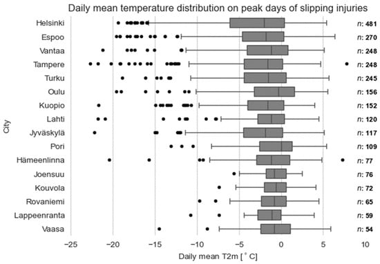 Near-zero temperatures or temperatures just below 0 °C can typically be seen to exist when peak days of slipping injuries occur. The statistics of the daily mean temperature on peak days of slip injuries are presented on box plots in Figure 5. The mean temperature of peak days varies between −3.3 °C (Helsinki) and −0.7 °C (Joensuu). The overall temperature scale of the peak days is quite large and there are several peak days when the daily mean temperature is very low, in some cases even below −20 °C. The temperature scale is larger in the bigger cities with a higher number of peak days compared to smaller cities with a lower number of peak days.
