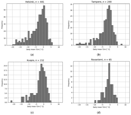 Frequency histograms of the daily mean temperature on peak days of slipping injuries for Helsinki (a), Tampere (b), Kuopio (c) and Rovaniemi (d) between the years 2005 and 2019. The number of peak days (n) is shown for each city. Figures for all cities are presented in the Supplementary Material (Figure S3).