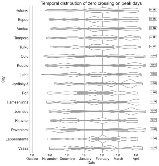 Temporal distribution of the wintertime zero crossings on peak days for all cities between October and April in winter 2005–2019 presented on a violin plot. The width of the span corresponds to the frequency of slip injuries, the wider the distribution is the more slip injuries happen. The white dot within each box represents the median dates of the zero crossings on the peak days. The box spans the 0.25 and 0.75 quantiles, and the whiskers represent the minimum and the maximum dates. Outliers are within the violin plot area. The number of zero crossing days during peak days (n) is presented for each city on the right.
