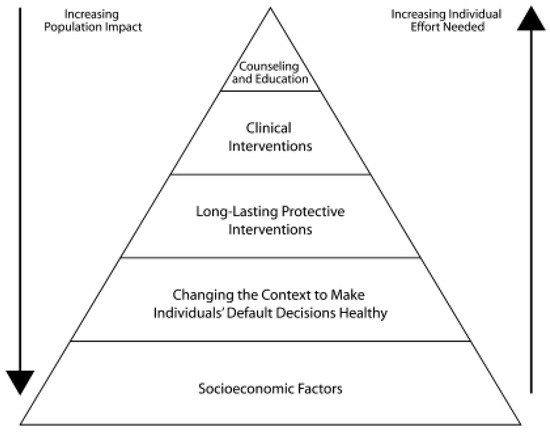 The health impact pyramid. Frieden, T.R. A framework for public health action: The health impact pyramid. Am. J. Public Health 2010, 100, p. 591. Copyright © American Public Health Association 2010 [17].