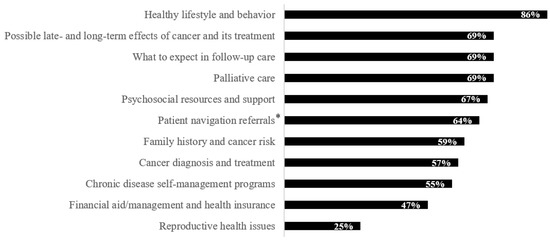 When asked about the types of information that are “very important” for NCCCPs and their partners to provide to cancer survivors and their caregivers, PDs rated healthy lifestyle and behavior as the most important information need (86%, n = 44), followed by possible late- and long-term effects of cancer and its treatment (69%, n = 35), what to expect in follow-up care (69%, n = 35), palliative care (69%, n = 35), psychosocial resources and support (67%, n = 34), and patient navigation referrals (64%, n = 32) (see Figure 2).