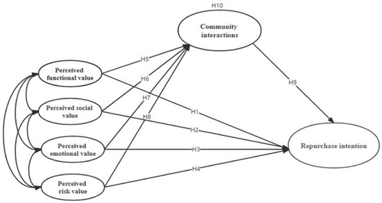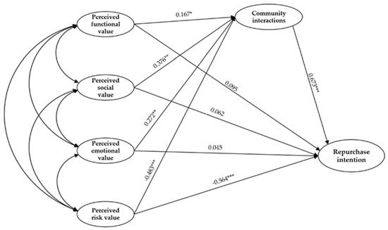 Table 7 shows that the structural equation model fit indices (χ2/df = 2.345, RMSEA = 0.062, CFI = 0.963, IFI = 0.963, TLI = 0.957, NFI = 0.938, SRMR = 0.036, GFI = 0.887) were consistent with the relevant indicators required [60]. The results show that perceived risk value significantly negatively impacts community interactions and repurchase intention; perceived functional, social, and emotional values significantly impact community interactions positively without significantly impacting repurchase intention. Community interactions have a significant positive impact on repurchase intention. Consequently, H1–H3 are not supported, and H4–H9 are supported (Figure 2).