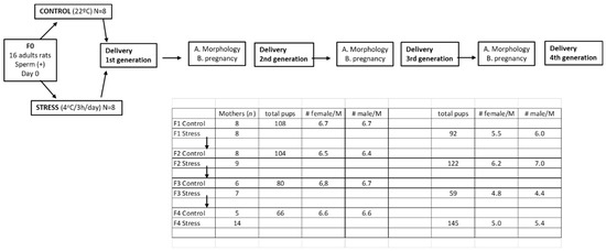 The chronic cold stress protocol for pregnant rats was the same as we previously used for adult rats in which we studied the first generation [13,16]. The mating procedure was as follows: Adults female rats were checked for estrus cycle activity to determine the proestrus day. On the night of the proestrus phase (when ovulation occurs), the rats were mated with males of proven fertility. The following morning, the rats were checked for the presence of a vaginal sperm plug. Rats with a vaginal plug were assigned as Day 0 of pregnancy and formed the F0 generation. The pregnancy was confirmed because after copulation, pregnant rats stop cycling, and they stay in a permanent diestrus stage. The first group of rats (F0) comprised 16 pregnant rats divided into two groups of eight control rats and eight stressed rats. The pregnant female rats from the experimental group were exposed daily to a temperature of 4 °C for 3 h a day throughout the gestation period. The control group was kept at a constant temperature of 20 °C throughout the gestation period. Dorfman et al. [14] firstly described the procedure in detail.