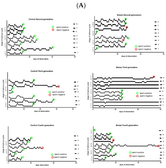 Figure 2 shows the estrus cycle activities of the control and stressed rats. The left side of Figure 2A shows the profile for control rats. Each rat has a characteristic cycle profile in which there regularly appeared peaks in the cycling behavior that corresponded to a proestrus stage. The green circle means that on the night of the proestrus day, the rat was mated with a male and presented with a sperm plug in the vagina (sperm positive) the next day. Almost all of the control rats were sperm positive and attained pregnancy. The red circle means that the rats were sperm positive but did not attain pregnancy. The right side shows the stressed rats across the different generations. A slight decrease in the number of sperm-positive rats was found in the second generation. This condition was clearly found in the third generation and returned to the control in the fourth generation. Because not all rats were pregnant in the first intent, rats were followed for different times up to 60 days for pregnancy. In Figure 2B are the same data but normalized as percentage of the time that rats were in the different stage of the estrus cycle. On the left side is the behavior of control rats of the second, third, and fourth generation. All the groups have a predicted behavior in that they remain in proestrus for less time (and thus in the fertile stage), followed by estrus, and almost 50% of the time were in metestrus–diestrus. However, in the stressed rats, the behavior presented many changes, especially in the third generation, in which a great percentage of the time, the rats were in estrus and spent almost no time in proestrus. The percentage of time was almost normal in the fourth generation.