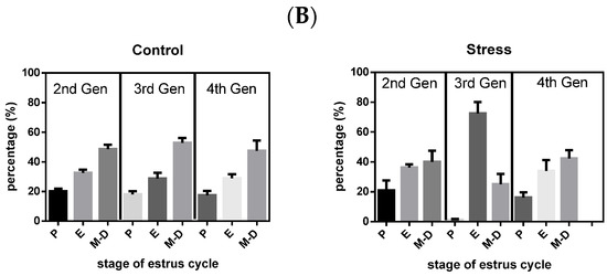 Gestational stress and its consequence on estrus cycle activity (A). The left side of this figure shows representative animals for each group of controls. The right side shows the cycle activity of representative animals of the stressed rats of different generations. The red circle means that during the night of proestrus, the female was mated with a male of proven fertility, but there was no copulation because there was not a sperm plug in the vagina. The green circle means that there was a sperm plug. When there is no circle, the female never accepted the male. (B) The percentage of the time that rats stay in each of the stage of estrus cycle along the observation period (up to observance of being sperm (+)). P, proestrus; E, estrus; M-D, metestrus–diestrus.