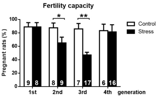Physiological impact of gestational stress on the second, third, and fourth generation of rats. Fertility is expressed as the percentage of total rats that became pregnant after being exposed to male rats. The results are shown as the mean ± s.e.m. of the number of rats in each graph. The results were analyzed with a chi-square test. Brackets show the significance between groups. * p< 0.05; ** p < 0.01.
