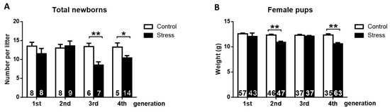 Physiological impact of gestational stress on the second, third, and fourth generations of rats. (A) The total number of newborn rats. In the graph, the number of pregnant rats in each group is shown. (B) The body weight of newborn female rats at 4 days. The results are shown as the mean ± s.e.m. of the number of rats in each graph. The results were analyzed with a one-way ANOVA followed by the Newman–Keuls post hoc test. Brackets show the significance between groups. * p < 0.05; ** p < 0.01.