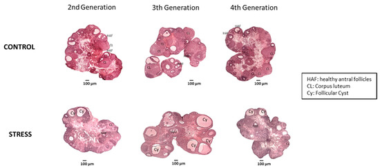 The local effect of stress at the ovary levels affected the follicular development over the generations as seen by the morphological analysis, and this is suggested in the uterus modification of the new follicular pool of at least two progenies of fetal ovaries. The fact that the number of healthy antral follicles declined without modifying follicular atresia directly affected the rate of ovulation as suggested by the continuous decrease in the number of corpus luteum. In addition, the total number of follicles (healthy, atretic, corpus luteum, and cyst) remained similar over the different generations, with the relative distribution between the generations having the clearest effect, going from a healthy reproductive process to a non-ovulatory process favoring the development of ovaries with a polycystic phenotype. Most probably, the mechanisms regulating the progression from preantral to ovulatory follicles were affected, and they were at least maintained during the four generations. Probably, epigenetic mechanisms are involved in these changes, such as the ones previously described as occurring after prenatal exposure to steroids [39]. Recently, a paper was published on ovary function and cold stress [40]. The authors used swimming in cold water, and they found an initial decrease in steroids hormones and a tendency to recover at longer times, probably by a compensatory effect of corticosterone [41]. It was also associated with changes in estrous cycle and ovary circulation. Unfortunately, there are no studies on the impact on next generations.