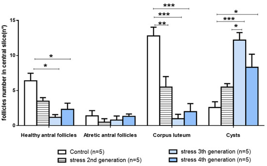 Ovarian follicular dynamic for the effect of gestational stress on the second, third, and fourth generations of rats. The number of healthy antral follicles, atretic follicles, corpus luteum, and cysts is presented. (n = 5); mean ± s.e.m. One-way ANOVA with Tukey’s multiple comparisons test (differences between brackets: * p < 0.05; ** p < 0.01; *** p < 0.001).