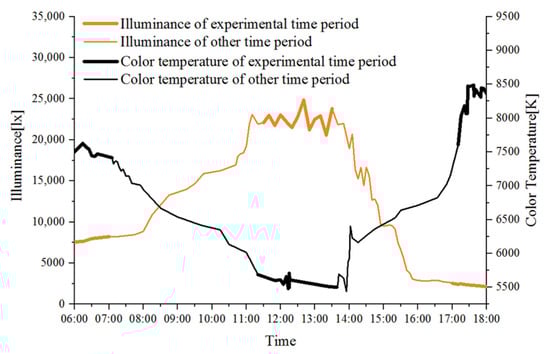 Before the formal test, we chose a clear daytime, by testing the sunlight illuminance and CCT at the test site located in Huzhou city during the time period from 6:00 to 18:00, and found the law of change, as shown in Figure 1. With the passage of time, the illuminance gradually becomes larger and the CCT gradually decreases, and remains stable when it increases or decreases to a certain value; then, the illuminance decreases and the CCT increases. Illuminance changes in the range of 2000~25,000 lx; CCT changes in the range of 5400~8500 K. Therefore, according to the above change law, three time periods with relatively large and stable differences were selected, which were morning (6:00–7:00), noon (11:00–13:00) and evening (17:00–18:00), and this time period was selected for the formal test.