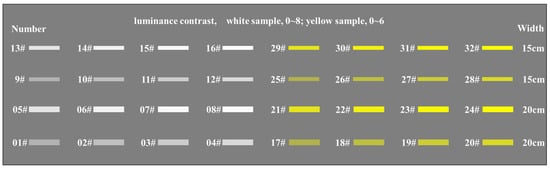 Based on the above analysis of the visibility of markings, we grade the status of pavement markings in the driver’s field of view in the experimental design scheme, as shown in Table 1. Considering the function of the in-service pavement markings, the state of markings in the field of view corresponding to scale 2 in Table 1 is used as the test subject’s visual recognition standard. The luminance contrast mentioned earlier is one of the influencing factors for the visibility of pavement markings. Since the luminance is influenced by various factors, such as angle and distance, the vertical luminance contrast at a height of 1.2 m is used in this study. The formula for calculating the luminance contrast is shown in Equation (1).
