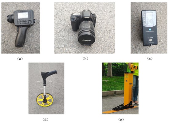 Experimental instruments and equipment. (a) Point luminance meter; (b) EOS20 camera; (c) Spectral irradiance meter; (d) Roller rangefinder; (e) Retroreflectometer.