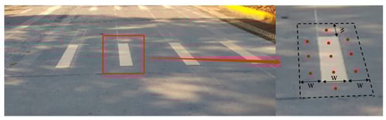 - First, modulate the camera to output RAW file format, then use the camera to shoot the test markings vertically downwards and record the image number in the data sheet; use the point type luminance meter to measure the luminance value of 3 points of the pavement marking area and 8 points of the adjacent road surface vertically downward, as shown in Figure 4, and record it in the data sheet; the height of the camera and the point luminance meter was 1.2 m.