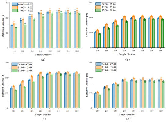 The effect of natural daylight condition on visual detection distance was tested using the nonparametric test method with unknown overall distribution (the Kruskal–Wallis test was used for more than two independent groups). The finding indicates that natural daylight condition can have a significant effect on visual distance at different pavement marking samples (p < 0.01) but the magnitude of difference is small (Cohen’s d < 0.10). The average value of drivers’ detection distances is taken as the effective detection distance. Figure 5 summarizes the results for the drivers’ detection distance of pavement marking sample reported as being seen as a function of the sample number and the daytime natural light environmental conditions. The experimental pavement markings are identified in Figure 5 by luminance contrast number. See Table 2 for the daytime natural light CCT and illuminance measured at different time periods (6:00–7:00; 11:00–13:00; 17:00–18:00) in Figure 5 during the experiment. The vertical bars in the plots in Figure 5a,b represent ±1 standard deviation (σ). The results show that the distance of pavement marking sample visible to a driver tracks directly with the luminance contrast of pavement marking to its surrounding road surface measured under similar environmental viewing conditions. The visibility of markings is best in the 11:00–13:00 time period (illuminance in the range of 21,000~23,000 lx; CCT in the range of 5500~6500 K). While in the 17:00–18:00 time period (illuminance in the range of 2000~3000 lx; CCT in the range of 7500~8500 K), the visibility of markings is worst.