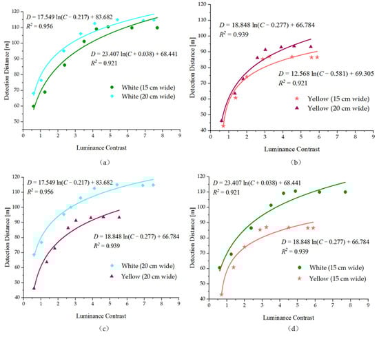 It is found that wider markings are more conducive to visual recognition. The values of detection distance with luminance contrast for the 20-cm wide marking is above the 15-cm wide marking, as shown in Figure 6a,b. The results show that under the same conditions of luminance contrast with the road, whether white or yellow marking, the 20-cm wide marking visibility is better than the 15-cm wide marking visibility. For the same reason, from Figure 6c,d, it can be seen that under the same luminance contrast conditions, white markings are more easily detected by drivers than yellow markings. For the same color and width of pavement marking, the distance detected by the driver increases with the increase in luminance contrast of the marking to the surrounding road, but after the luminance contrast reaches a certain value, the change in detection distance with its growth is no longer obvious.