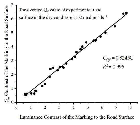 Road surfaces in the dry condition have Qd values in the range from 50 to 100 mcd·m−2·lx−1, or even higher []. The Qd values measured of the experimental asphalt road surface were averaged and the results were 52 mcd·m−2·lx−1. This study attempts to establish a relationship between the luminance contrast of the marking to the road surface and the Qd contrast, and we obtain the Qd safety requirement threshold of the pavement marking from the known Qd value of 52 mcd·m−2·lx−1 of the road surface. The formula for calculating the Qd contrast is shown in Equation (6).