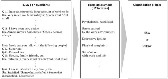 The BJSQ consists of the following question groups: work stressors, mental and physical stress reactions, and the surrounding support [30]. The subjects whose total standardized scores for mental and physical stress reactions were under 12 are classified as HSWs. Alternatively, the subjects whose standardized scores for the work stressors and the surrounding supports are under 26 and whose standardized scores for the mental and physical stress reactions are under 17 are also classified as HSWs. To determine HSWs using the BJSQ, we used the calculation program provided by Tokyo Medical University, Department of Preventive Medicine and Public Health [31]. Figure 1 shows the procedure of BJSQ stress assessment to classify HSWs.