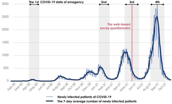 The survey period of this study was from 19 May to 21 May 2021. The period encompassed the third time a state of emergency was declared in Osaka Prefecture during the pandemic (from 25 April to 20 June 2021). During the emergency declaration, Osaka Prefecture requested residents to not only work from home but also refrain from nonurgent outings and drinking alcohol in a group on the street or in the park; they suspended the operation of restaurants after 8:00 p.m. and prohibited large-scale events [32]. Figure 2 shows the number of new cases of COVID-19 infection in Osaka Prefecture, according to data from the Japan Broadcasting Corporation [33]. This survey period took place 1 year after the start of the COVID-19 pandemic. The WFH environment was considered to have improved by the start of the survey period.
