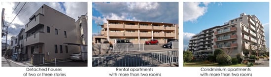 We targeted these three housing types because they were the most common types of residences in Japan, according to the housing and land survey of Japan [34]. There are about 28.82 million detached houses, 38.96 million apartments, and 2.07 million terrace houses. The number of DHtwo or three stories is about 22.9 million, which is 79.5% of the total number of detached houses. Concerning residential apartments, we assumed that households with housemates live in residences with two or more rooms; hence, we analyzed residential apartments with two or more rooms, encompassing rental apartments and condominium apartments. Figure 3 shows common images of each residential type.