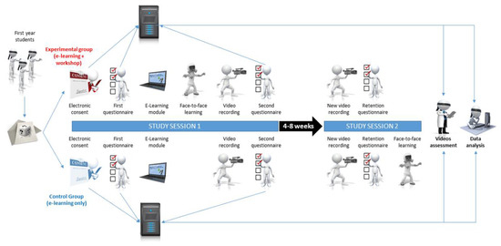 Four to eight weeks after this initial intervention, depending on the schools’ schedules, participants were invited to a second session. Both groups first repeated the video recording of the PPE doffing sequence, then logged into the platform to electronically rebuild the doffing sequence. The experimental group was then considered as having completed the study path, while the control group attended a face-to-face learning session to ensure that all participants had ultimately been given the same level of training regardless of their initial allocation.