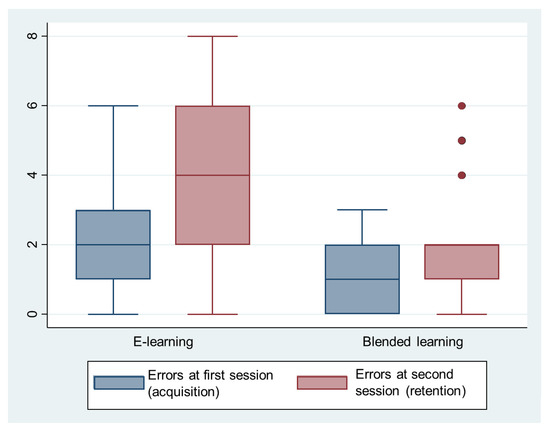 The proportion of student paramedics adequately performing the PPE doffing procedure was lower during the follow-up sessions. However, skill retention was still higher in student paramedics who had followed both interventions in comparison with those who had only followed the e-learning module. Once again, there was no significant difference between groups in the ability of adequately rebuilding the full PPE doffing sequence on the web platform.