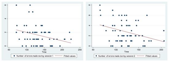 The number of errors was significantly lower in the experimental group (Figure 3, Table 4). A weak correlation (first session, r = −0.31, p = 0.012, second session, r = −0.33, p = 0.007) was found between the time needed to perform the procedure and the number of errors made (Figure 4). There was a 0.74 error per minute decrease (95%CI 0.17 to 1.32, p = 0.012) during the first sessions and a 1.41 error per minute decrease (95%CI 0.40 to 2.42, p = 0.007) during the second sessions. The predictivity of this model is however very low (r squared = 0.1 for both sessions).