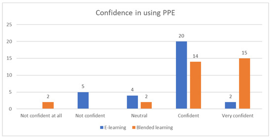 Satisfaction (Figure 5) and confidence in using PPE (Figure 6) were significantly different between groups (p = 0.016 and p < 0.001, respectively).