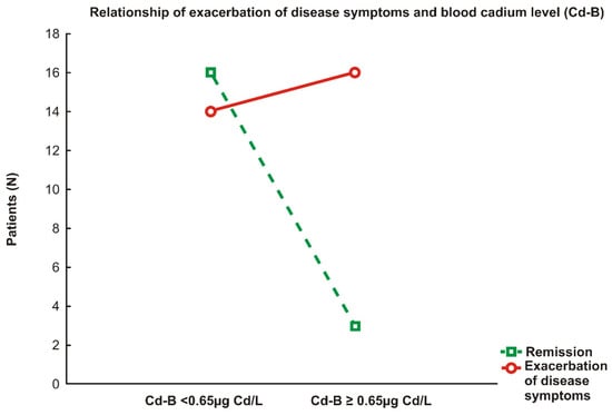 More than 84% of IA patients whose Cd-B was equal to or higher than the upper quartile value for the study population (0.65 μg/L) faced disease symptom exacerbation, whereas remission occurred in 15.8% only. These dependencies were statistically significant (Yates’ chi2 = 3.91, p < 0.05; r = 0.375, p < 0.05).