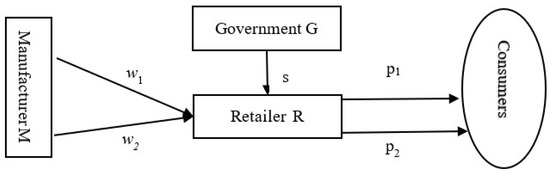 The manufacturer produces two complementary products: green products 1 (such as a computer mainframe) and green products 2 (such as computer monitors and network devices), and sells them to the common retailer simultaneously. To reduce notation and without a further loss of generality, we assume that products 1 and 2 have complete complementary symmetry and are completely symmetrical in the market demand, as well as being cost coefficient. Relative to asymmetric complementary products, such as washing machines and laundry fluids, cars and seat covers, symmetrical complementary products, such as printers and ink cartridges, computers and network equipment, contribute almost equally to consumers’ consumption values. The green degree (greenness) of products 1 and 2 are assumed to be and . The green degree of products can be used to evaluate the economic rationality, resource effectiveness and environmental coordination of green products. Moreover, the product green degree can refer to the degree of friendliness of products to the environment or the comprehensive evaluation of the green, economic and advanced technologies of the products. Therefore, in comparison to ordinary products, the higher the technical and environmental coordination of the green products, the higher the greenness. In this paper, we assume that the greenness of a product is determined by the manufacturer’s green technology investment. Therefore, the green products are costly because of the green technologies or the introduction of new equipment reducing the environmental impact of the manufacturing process. By referring to [27,33], it can be observed that the green production costs faced by the manufacturer are and , respectively, where is the manufacturer’s green manufacturing coefficient. Similar to Dobson et al. (2020) [16], we set the production cost of the complementary products to zero. The retailer offers complementary products to consumers at retail prices and , and receives green subsidies from the government. This paper considers the government’s green subsidy at a fixed rate for green products 1 only to the retailer, and this subsidy is linearly related to the greenness of products 1, i.e., the higher the greenness, the higher the subsidy, according to [33]. The unit product subsidy received by the retailer is , where () is the government’s green subsidy coefficient per unit product.