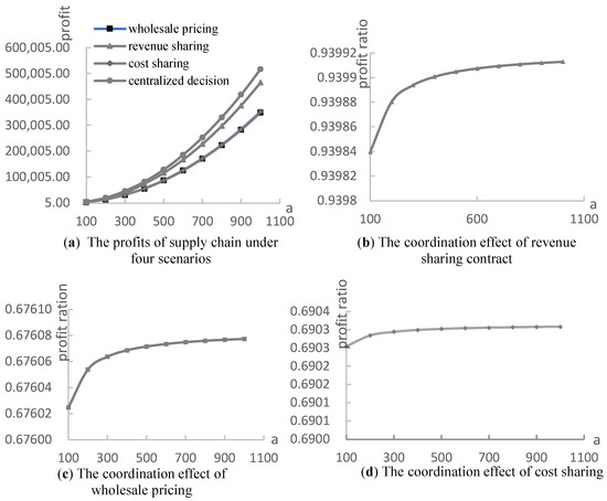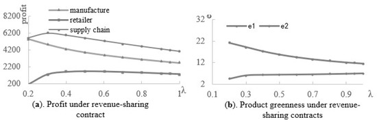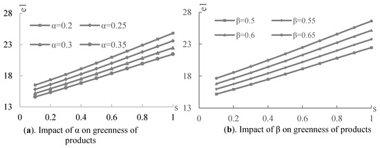 The above corollary is obtained by analyzing the coefficients of in the game-solving process. For example, the coefficient, , in with respect to is a decreasing function of , that is, when decreases, increases, so has a significant effect on the product greenness. When , it happens to be the greenness decision in the case of the wholesale price contract, so when , the product is greener under the revenue-sharing contract than that under the wholesale price contract. The other analyses are similar.