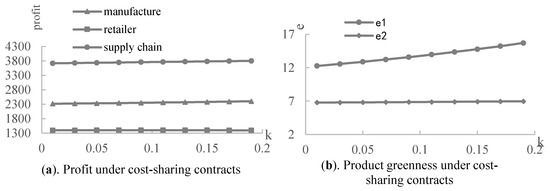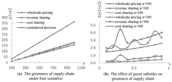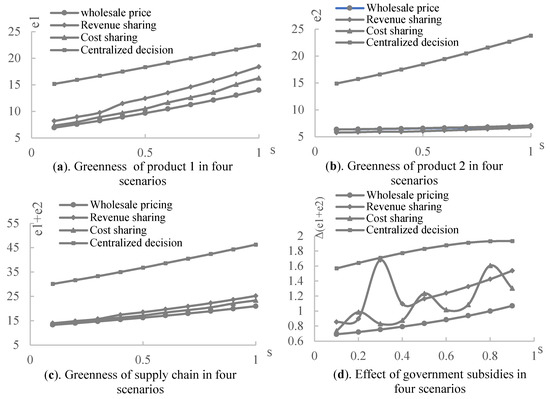 Under the cost-sharing contract, when is appropriate, . The influence of the government green subsidy coefficient on the greenness of the products is and , and there are , , . Compared with the centralized decision situation and the wholesale price contract, and.