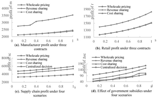 In the retailer’s response function, if and are assumed to be the determined product greenness, then the effect of the government subsidy () on the retail price is closely related to the value of . Then, the government subsidy coefficient becomes , while it is in the wholesale price contract case. Since , becomes smaller as decreases, that is, the actual government subsidy coefficient under the revenue-sharing contract decreases. In other words, the fewer the retailer shares from the revenue from product 1, the smaller the actual government subsidy coefficient. Furthermore, when , the revenue-sharing contract is just equivalent to the wholesale price contract with . Therefore, under the revenue-sharing contract, when , the effect of the government green subsidy rate on the retailer’s profit per unit of product becomes smaller, because the government’s subsidy on the greenness is removed. The retailer actually shares the government’s green subsidies with the upstream manufacturer in the form of revenue sharing, transferring a portion of the green subsidies to them. The benefit of this sharing by the retailer encourages the manufacturer to increase the product greenness, and thus increase the actual subsidy amount and profit. Under the revenue-sharing contract, unlike the wholesale price contract, the retailer’s product sale price relates positively to the wholesale price and greenness of not only the product itself, but also the complementary product.