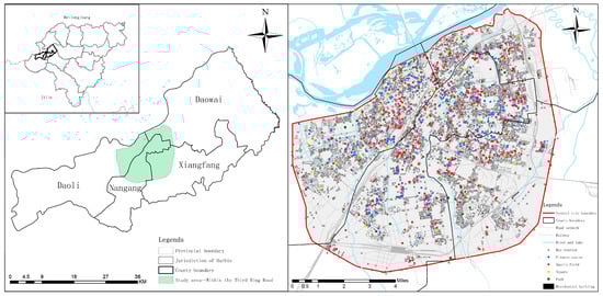 This case study area is the central urban area of Harbin, mainly including 4 districts within the Third Ring Road (Figure 1). The 4 urban districts have a permanent population of 4.09 million, with a population density of about 2711 people/km2. Harbin, located in the northernmost part of China, is a big city with the highest latitude and lowest temperature nationwide. Harbin has four distinct seasons. Winter is long and cold, summer is short and cool, and the temperature in spring and autumn drastically changes and the time is short. The unique geographical location shapes the prosperous ice and snow culture and ice sports in Harbin, but also makes the daily physical exercise greatly influenced by the climate. Walking and public transportation are equally important. The highway traffic of Harbin city is developed, showing the pattern of “one axis, four rings and eleven lines”. The rail traffic construction is still in development, and there are three subway lines. At present, most of the research on the equity of accessibility to sports space in China is concentrated in the south and first-tier cities, but few in cities in cold regions. At the same time, Harbin is also carrying out the 15-min and 30-min fitness circle plan, and the study of urban public sports space equity boasts practical significance and long-term value for the inspection of the existing scheme and future urban planning.