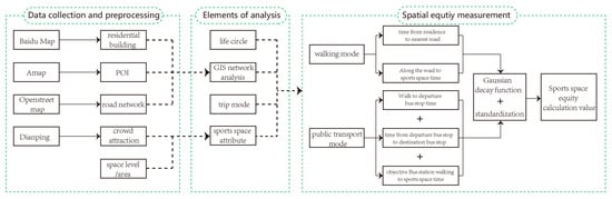 After obtaining the required data, we need to import it into ArcGIS software for pre-processing, convert it into spatial data, eliminate invalid information and establish a database. The main method of research measurement is related to the sports space that can be achieved under certain circumstances starting from residential buildings, including the attributes of the sports space itself. The tool adopted in the research is the network analysis module in ArcGIS, and the key control information required for the module operation includes time/distance, speed/mode of transportation, corresponding to 15 and 30 min in the concept of “life circle”. At the same time, the mode of transportation also requires attention. Compared with single mode, spatial equity analysis under multi-mode travel can provide more realistic assessment [] because it takes diverse consideration of travelling ability from the human scale. Therefore, the measurement of public sports space equity in central urban areas in this study includes 2 parts: the sum of calculated values of sports space accessible from residential buildings within 15min (about 1000 m) by walking and within 30min by bus []. In this part, we use ArcGIS network analysis module to work out the shortest path from residential buildings to sports space within two-time circles. The overall calculation process is shown in Figure 2 [,,].
