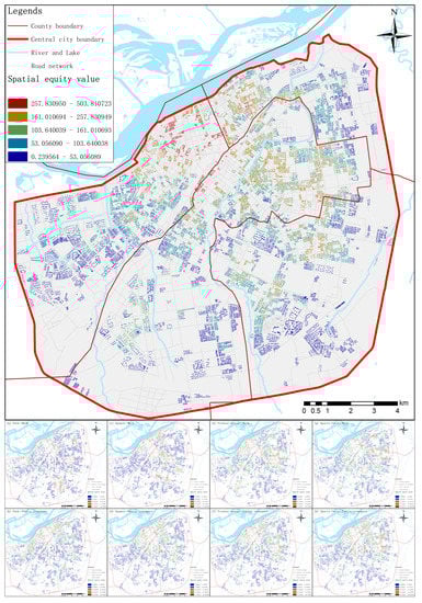 where indicates the equity value of public sports space from residential building in walking mode; represents the shortest walking time from residential building to sports space ; is the maximum time by walking, i.e., 15 min; shows the service capacity of sports space , namely, the level of sports space classified above; represents the comprehensive assessment value of sports space by the people, namely, the score of Dianping; indicates a simplified Gaussian time decay function, which can represent the change in the influence of the walking time on spatial equity. It should be pointed out that after all of the calculations, we standardized the results according to the categories of sports space, that is, we assumed that the four types of sports space were equally important.