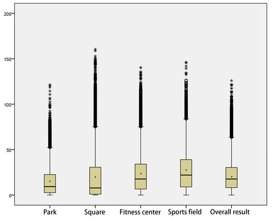 The spatial visualization results let us know which specific regions in the city have unequal spatial distribution of sports, and we also need to compare the degree of differences of such inequity. As shown in Table 2 and Figure 4, both the overall and classification results showed obvious skewed distribution, with the mean larger than the median. The data with low spatial equity accounted for a higher proportion and had more concentrated distribution. Parks, squares, fitness centers and stadiums averaged 14.8, 20.2, 23.4 and 27.2, respectively. The average, median and high values of parks are relatively poor, but the standard deviation is the lowest, the overall data distribution is the most concentrated, and the internal gap is smaller than other types of sports space. The results of the square category showed obvious differences, with 50% data values lower than 7.9. The internal relative gap was the largest among all types, and the spatial distribution of sports was the most inequitable. The results of fitness center and stadium categories are similar, and the overall data structure is superior to the first two types of sports space. At the same time, the overall performance of the stadium category is slightly better than that of the fitness center category, reflected in larger mean and median. After the integration of the results of the 4 types, although there is still a relatively unequal situation, that is, 25% of residential buildings and the people in them enjoy a high level of sports space, the overall data structure has been improved, the relative gap of spatial fairness in urban areas has been narrowed to a certain extent, and the distribution of data has become more balanced.