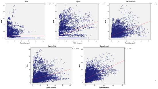 As shown in Figure 5, the correlation results in different categories are different. Apart from parks, all of the other categories and the overall results pass the significance test (p < 0.01), indicating that the spatial equity of the people in the two modes is also closely related. The of square, fitness center, sports field and overall results were 0.121, 0.228, 0.108 and 0.252, respectively, showing significant correlation between the 2 modes. In other words, the equity of people having access to the sports space is similar in different traffic modes. When the equity value in the walking mode is low, the equity value in the bus travel mode is generally not high. The results of spaces such as parks did not pass the significance test, and the value was very low, indicating that there was no linear correlation between the influences of the two traffic modes on spatial equity. However, the value after overall superposition is the largest, indicating that when comprehensively considering multi-type sports space, the results of spatial equity calculated by the two traffic modes are similar. In other words, the spatial configuration of sports space, urban road network, traffic stations and other elements is actually inequitable. If people only reach the sports space by walking and bus, the status quo of inequity cannot be changed.