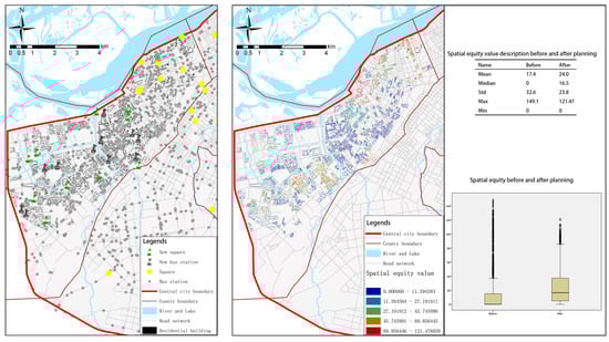 In this study, multi-dimensional visualization results were obtained to objectively show the status quo of sports space equity in central urban areas, which could support scientific planning intervention and decision-making. In the results of this study, squares have the biggest internal gap and the most inequitable overall situation among all of the types. Taking Daoli District as an example, we simply optimized the layout of facilities in combination with the concepts of the existing urban planning and life circle, including transforming existing vacant land, wasteland, garbage dump and other land with low utilization rate into squares and making up for areas with weak public transportation network. The results are shown in Figure 6. After spatial layout adjustment, the mean and median of spatial equity of squares increased significantly, the standard deviation became smaller, the overall distribution change was smoother, and the low value points also decreased significantly. It can be seen that targeted planning intervention can have a direct impact, and the spatial equity of the region has been positively optimized. However, we tend to overlook the problem and think that spatial equity is simply a homogeneous distribution of facilities or services, which can only remain in the ideal planning blueprint. According to previous studies, we need to consider the sports space with different functions and of different types [,,], and different groups of people choose different sports space []. The starting point of spatial equity is to take people’s demand as orientation. We have obtained the status quo of spatial equity in the central urban area, which needs to be improved. However, before that, we need to understand the actual demand, for example, through the questionnaire of people’s demand, so as to make the most scientific and reasonable spatial planning.