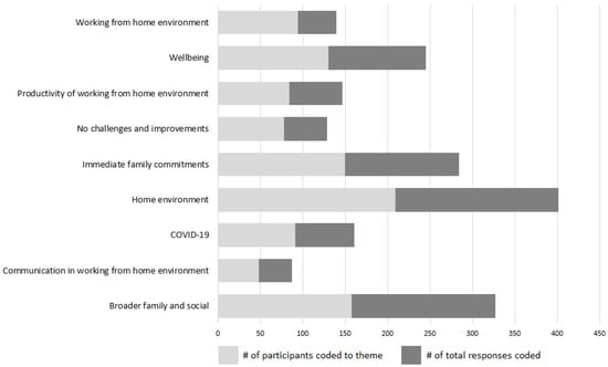 A total of n = 1921 thematic units were coded using 1042 unique participant references across nine broad themes (Figure 1), producing an average of 1.80 themes coded per participant (with range of 0–6 and mode equal to 1). Of the 646 responders, n = 10 participants were unable to be coded within any theme due to ambiguity or a nonsensical response. The three most reported themes were the immediate family commitments, the broader family and social commitments, and the home/work environment. Through content analysis, a total of nine broad themes and 36 sub-themes were identified, which are described below under their broad themes.