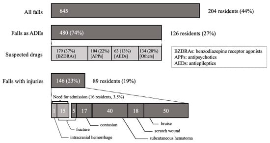 The primary outcome of this study was the number of falls, defined as unintentionally coming to the ground or some lower level for a reason other than as a consequence of sustaining a violent blow, loss of consciousness, sudden onset of paralysis in stroke, or an epileptic seizure []. For all falls, the presence of injury and the potential triggers of falls including medications, physical conditions, psychiatric conditions, operation errors of walking aids, slippage of the feet, trouble with clothes and shoes, obstacles, and mistakes during caregiving were assessed. In particular, if the medication was considered to be a potential trigger for the fall, the fall was defined as an adverse drug event (ADE) []. Fall injury was defined as a body lesion at the organic level, resulting from acute exposure to energy in amounts that exceed the threshold of physiological tolerance []. The injuries were classified as bruises, scratch wounds, subcutaneous hematomas, contusions, fractures, and intracranial hemorrhages. Falls with no apparent injury were classified as falls without injury. When residents were taken to the hospital immediately after the fall and left their nursing home on the same day, they were considered to have a “need for admission”.