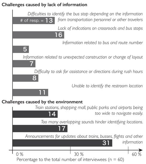 A basic objective of this study was to shed light on the strategies that people who are visually impaired used when navigating an environment, including natural sounds and auditory cues, to acquire the necessary spatial awareness. Thus, the interview questions were designed to solicit basic information that seems to be crucial to those individuals before, during, and after traveling. However, in countries where there are no auditory cues designed for the visually impaired, the participants utilized available natural sounds. By translating these sounds into information, they are able to recognize the layout of the environment, identify and localize objects, maintain the correct direction, walk in a straight line, and avoid hazards. Similar results have been reported in previous research [17,36,37].