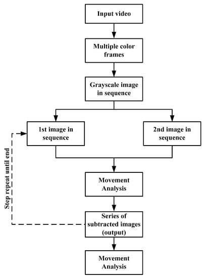 Figure 3 presents a flowchart of the movement analysis. A recorded video was provided as input to the analysis. This input video was then converted into multiple frames of color images by using MATLAB, with two images obtained per second. For example, a 5-min video comprised 600 continuous images.
