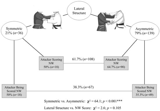 Considering the judoists’ TW lateral structure adopted before an NWGS, we observed that asymmetric positions predominated compared with symmetric positions (79% of cases; p < 0.001). Nevertheless, the lateral structure was not associated with scoring during NW by the TW attacker (Figure 1).