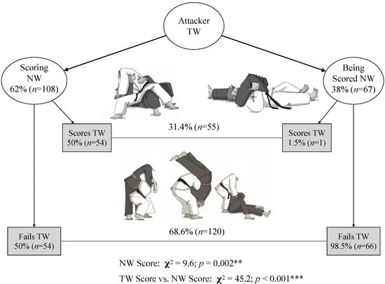 We organized the movement structure of the attacking action during TW following the motor criteria described in previous work of our group []. Briefly, this movement structure criterium classifies the techniques according to the occurrence of turning before the TW action (T-TW), techniques without turning before the TW action (WT-TW), or techniques that are performed during supine position (SP-TW). Furthermore, we registered the success or failure of the TW action before NW and the fact that the TW performer scored or was scored in NW.