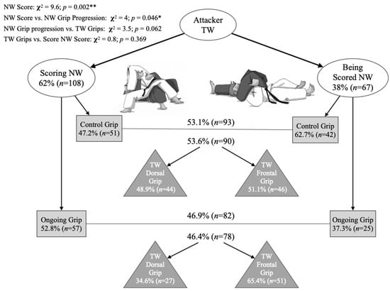 The present study is the first work in the literature that has considered grips during TW with NWGS. Frontal TW grips were predominant in NW, and the grip configurations more frequently employed during TW were the classical ones, dorsal-sleeve, and the flap-sleeve. However, no specific TW grip was related to success or grip progression on the ground. Future studies designs should determine if some grips are more efficient than others to score on the ground by analyzing successful or unsuccessful grappling techniques. Furthermore, sports scientists should clarify if the gripping efficiency to obtain a score in NW is more related to the chances of a specific grip configuration to apply grappling techniques or to the volume of the practice of the classical grips linking with NW work. Even though grip progression (control grip or ongoing grip) presented a balanced distribution in NWGS, ongoing grips were employed with a higher frequency to win on the ground by the TW attacker, and the control grip was used more to score by the TW defender.