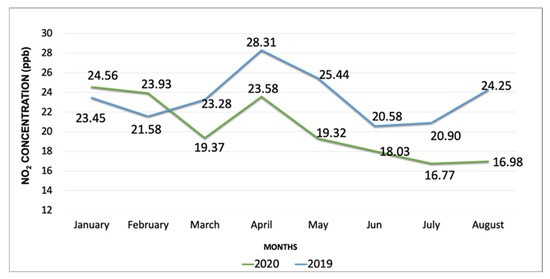 Variation in monthly mean NO2 concentrations (ppb) from January to August in 2019 and 2020.